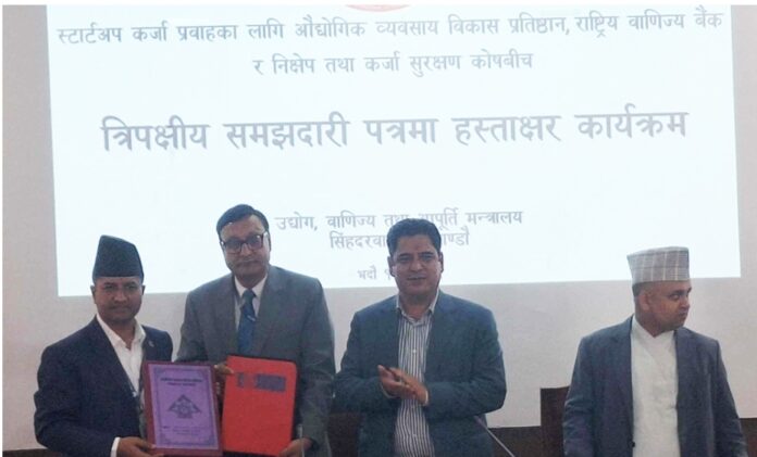 स्टार्टअप कर्जा प्रवाहका लागि औद्योगिक व्यवसाय विकास प्रतिष्ठान, राष्ट्रिय वाणिज्य बैंक र निक्षेप तथा कर्जा सुरक्षण कोषबीच त्रिपक्षीय समझदारी पत्रमा हस्ताक्षर कार्यक्रम सम्मपन्न भएको छ ।